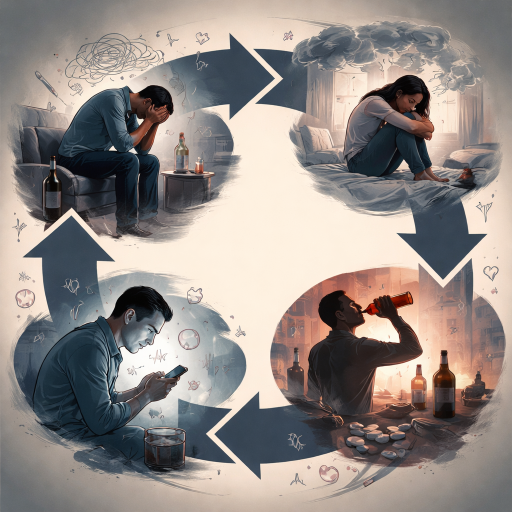 In clinical work, these states rarely appear in isolation. Instead, they form a psychological loop, a system in which the mind and body learn patterns that feel protective in the short term but gradually become destructive. What begins as coping quietly evolves into compulsion. What once felt like survival becomes a trap.